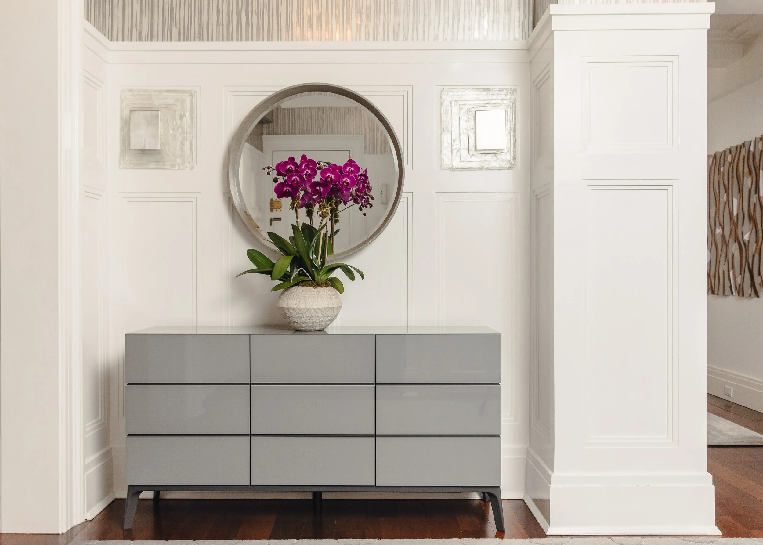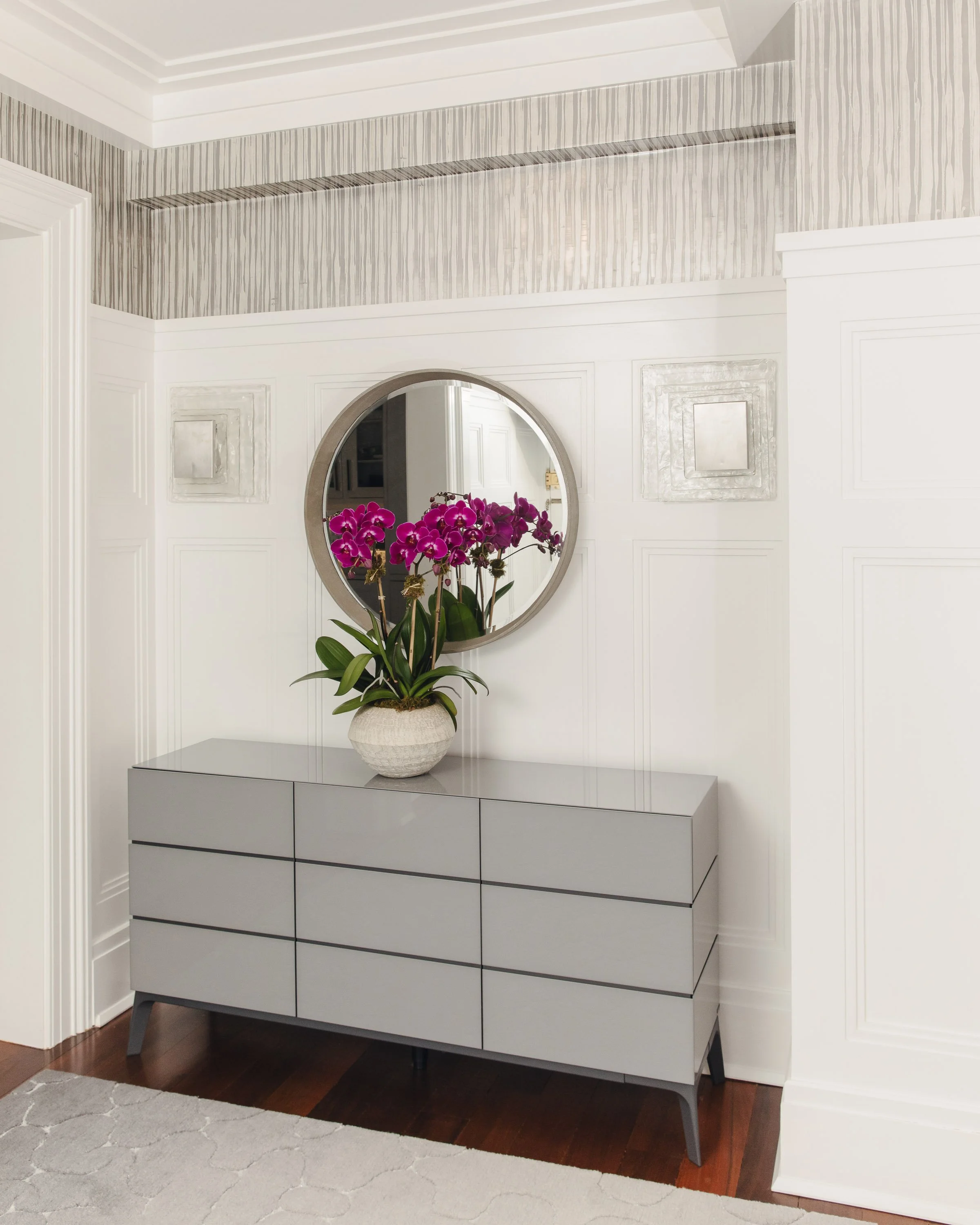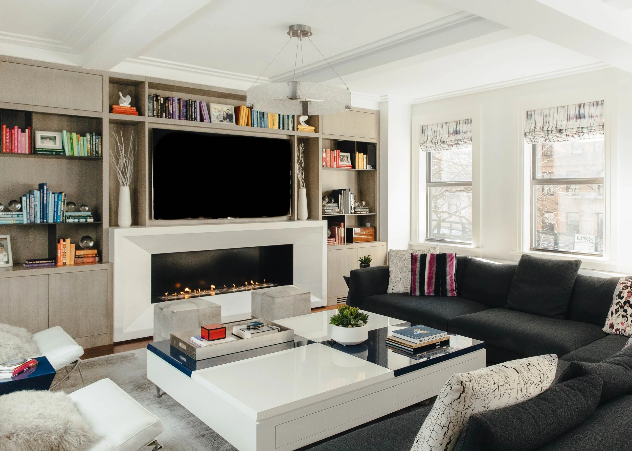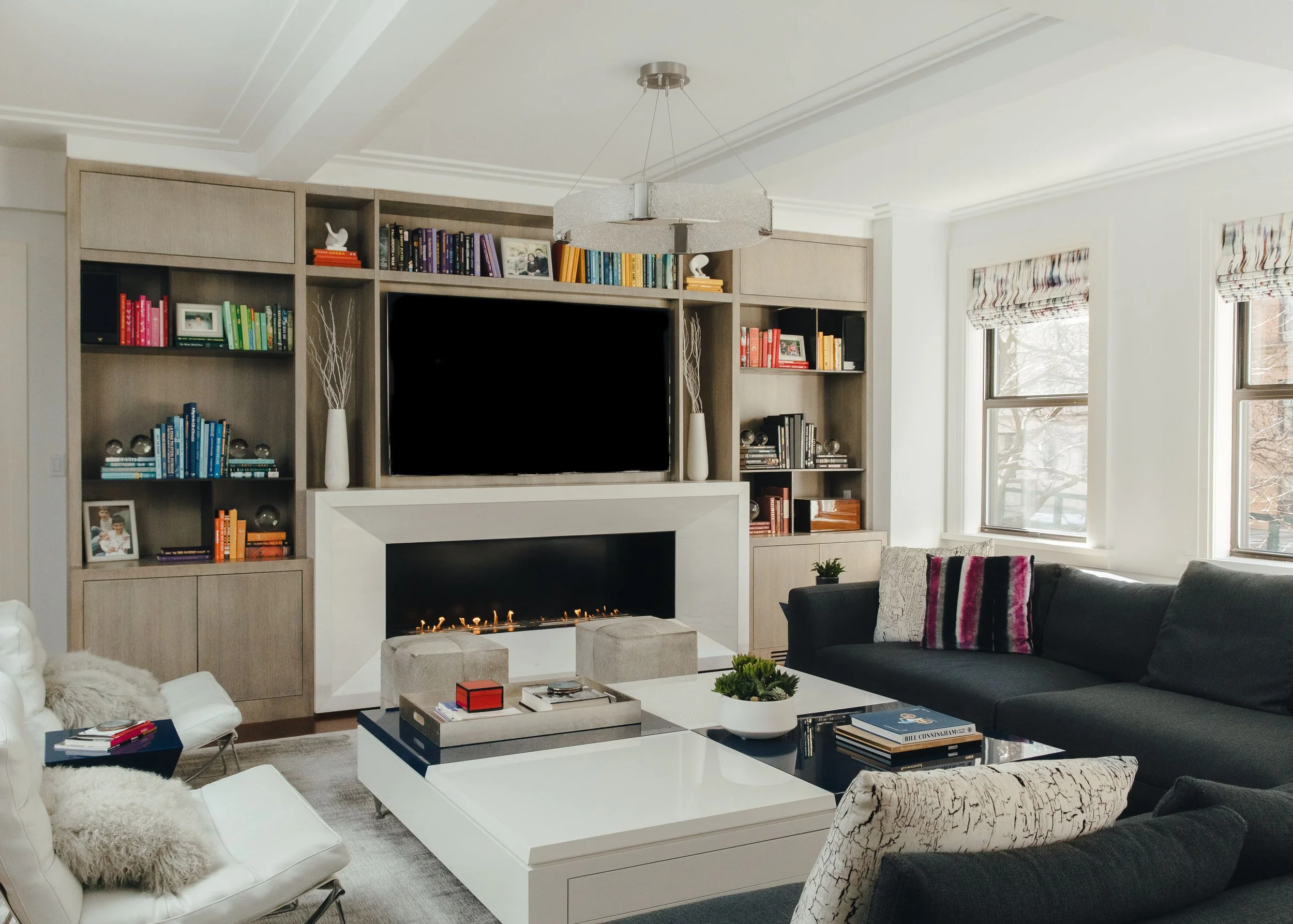 This NYC apartment had recently undergone a renovation when we were brought in to further refine the space and make it feel warm and inviting. In the foyer, textured rugs and thoughtfully selected furniture define the entry and create a welcoming first impression, while the family room was enhanced to bring cohesion and ease to everyday living. The bedrooms were fully reimagined with custom built-in storage and new wall coverings, balancing functionality with comfort and creating spaces that feel personal and inviting.